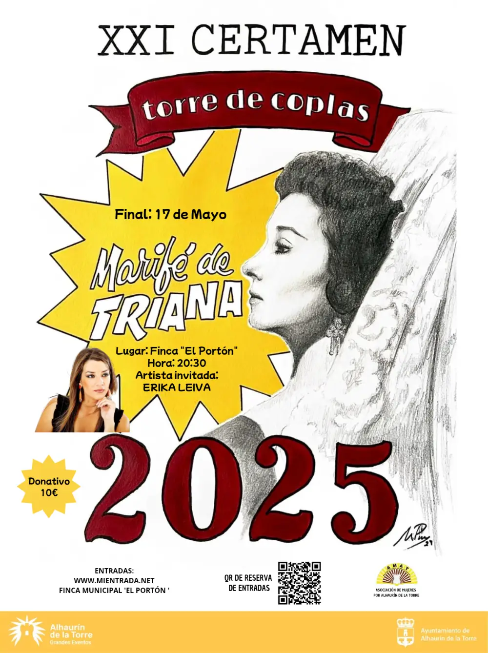 31/03/2025. Alhaurín de la Torre. – El emblemático Certamen Torre de Coplas ‘Marifé de Triana’, que este año alcanza su vigésimo primera edición, culminará el próximo 17 de mayo con su gran final en el Auditorio de la Finca Municipal El Portón, a partir de las 20:30 horas.