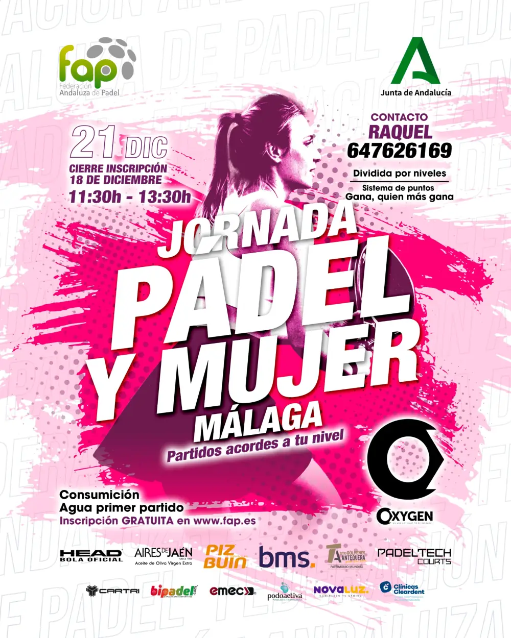 En Málaga, las instalaciones del club Oxygen albergarán la Jornada Pádel y Mujer. Será el 21 de diciembre, de 11.30h a 13.30h. El cierre de inscripción es el 18 de diciembre.