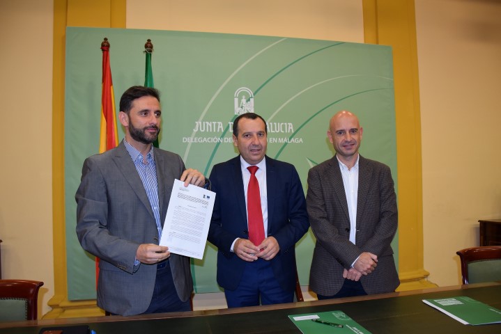 El delegado del Gobierno, junto al delegado territorial de Agricultura, Pesca y Desarrollo Rural, Javier Salas, ha hecho entrega al presidente del Grupo de Desarrollo Rural Sierra de las Nieves, José Antonio Gómez, de la resolución por la que se aprueban las partidas para poner en marcha la Estrategia de Desarrollo Local en 23 municipios de la Serranía de Ronda, que contará con 4,1 millones de euros para la dinamización económica de la comarca.
