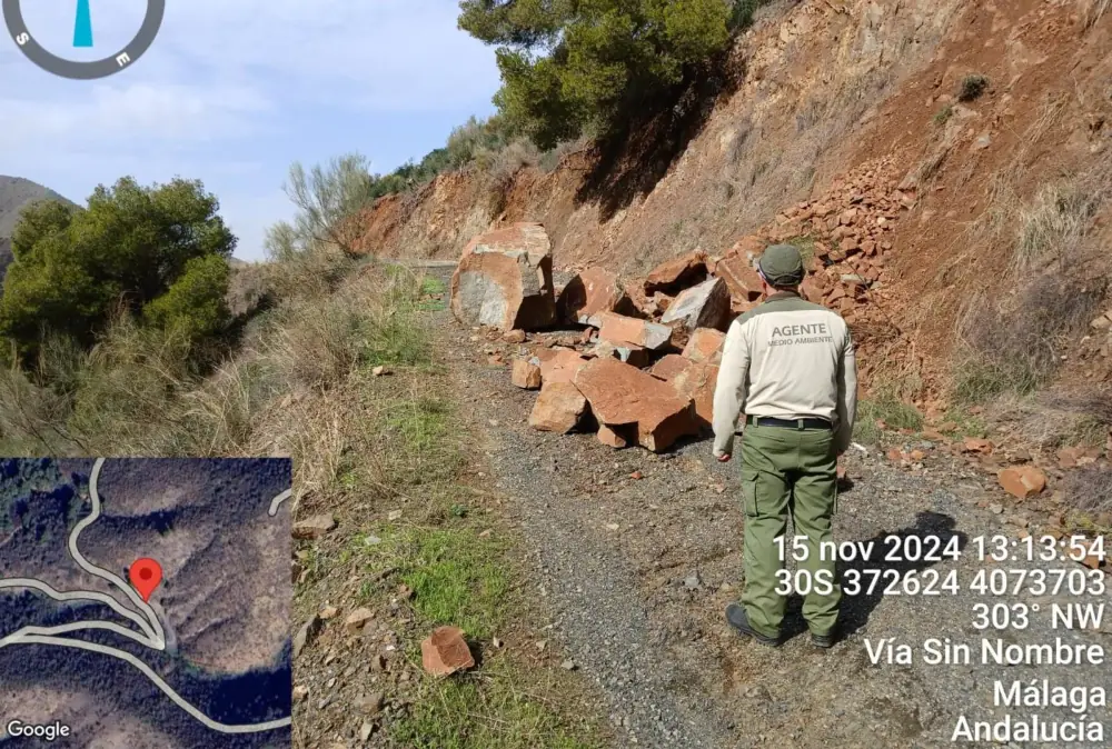 La Delegación Territorial de la Consejería de Sostenibilidad, Medio Ambiente y Economía Azul en Málaga ha iniciado una serie de actuaciones para despejar y reparar los caminos afectados por los daños de la DANA en los Montes de Málaga. Las fuertes lluvias del pasado miércoles 13 de noviembre provocaron importantes desperfectos en varios carriles que comunican la zona de Fuente la Reina-Contadoras con la finca El Boticario, dejando a los vecinos incomunicados.