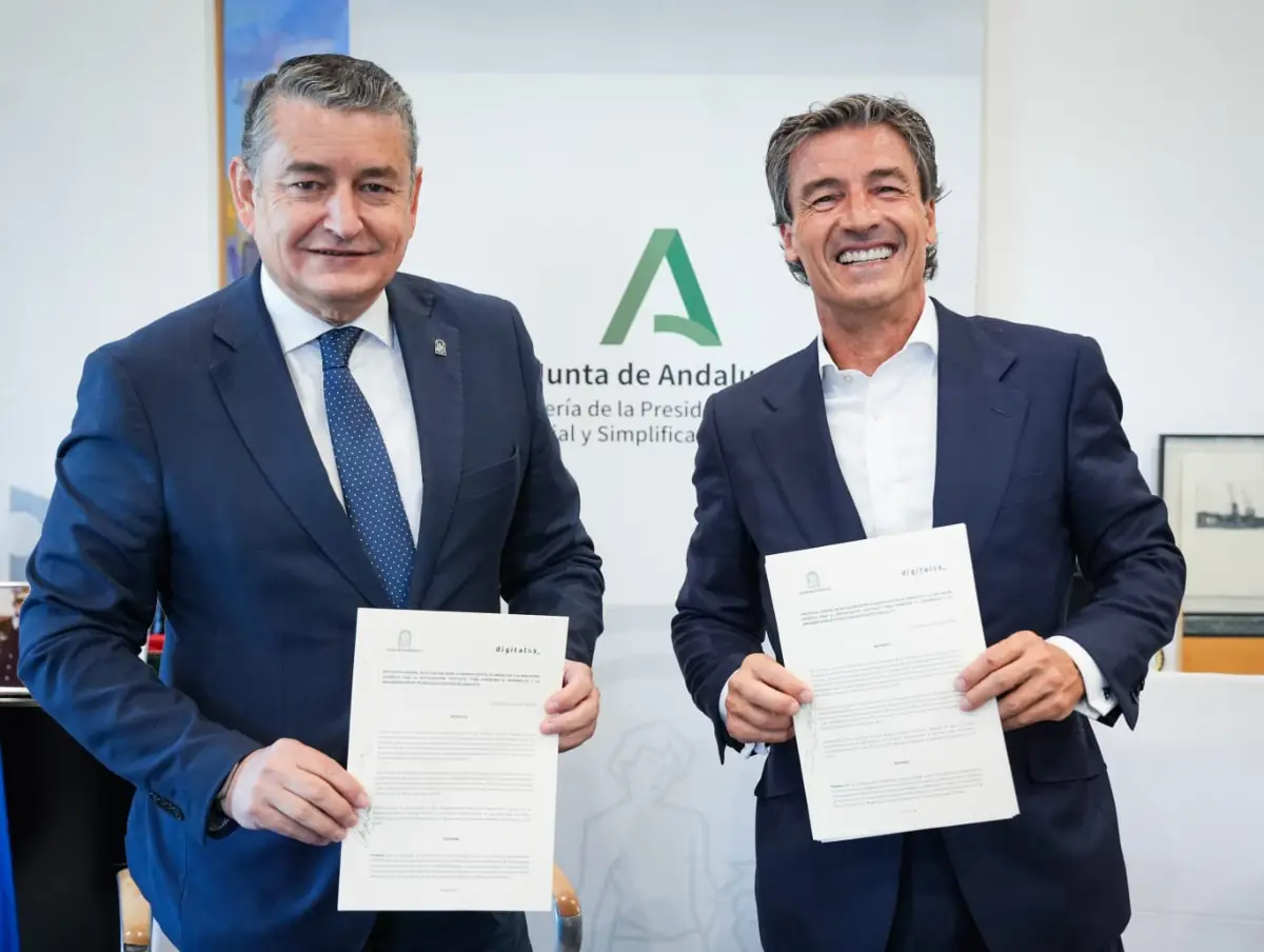 El consejero de la Presidencia, Interior, Diálogo Social y Simplificación Administrativa, Antonio Sanz, y el presidente de la Asociación Española para la Digitalización DigitalES, Federico Linares, han firmado esta mañana un protocolo de colaboración para promover el desarrollo y la implementación de tecnologías digitales en Andalucía.