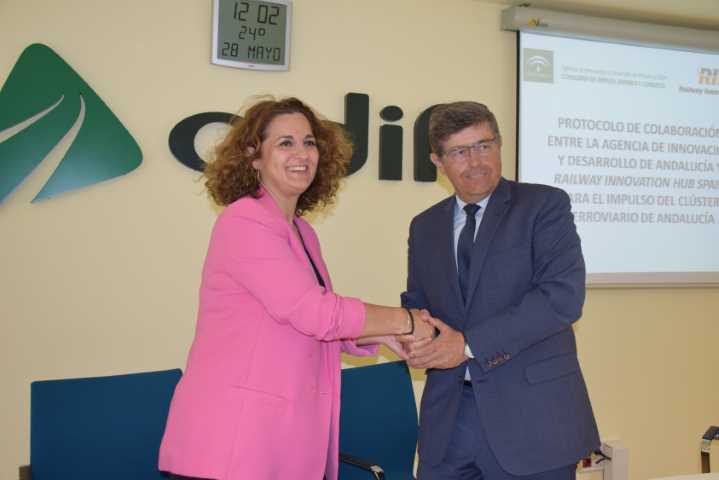 La vicenconsejera de Empleo, Empresa y Comercio y presidenta de la Agencia de Innovación y Desarrollo de Andalucía IDEA, Pilar Serrano, y el presidente de la Asociación The Railway Innovation Hub Spain, Juan Elízaga, han firmado hoy en Málaga un protocolo con el objeto de impulsar el Clúster Ferroviario de Andalucía, un sector que cuenta con suficientes capacidades para conformar un ecosistema de innovación de referencia internacional, según se recoge en el protocolo.