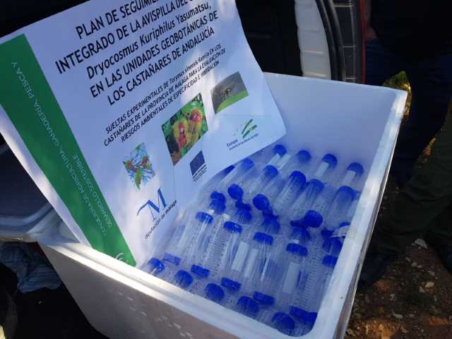 La delegación territorial de Agricultura, Ganadería, Pesca y Desarrollo Sostenible ha procedido hoy, en colaboración con la Diputación Provincial de Málaga, a la suelta de las primeras dosis del Torymus Sinensis, el depredador biológico para luchar contra la avispilla del castaño.