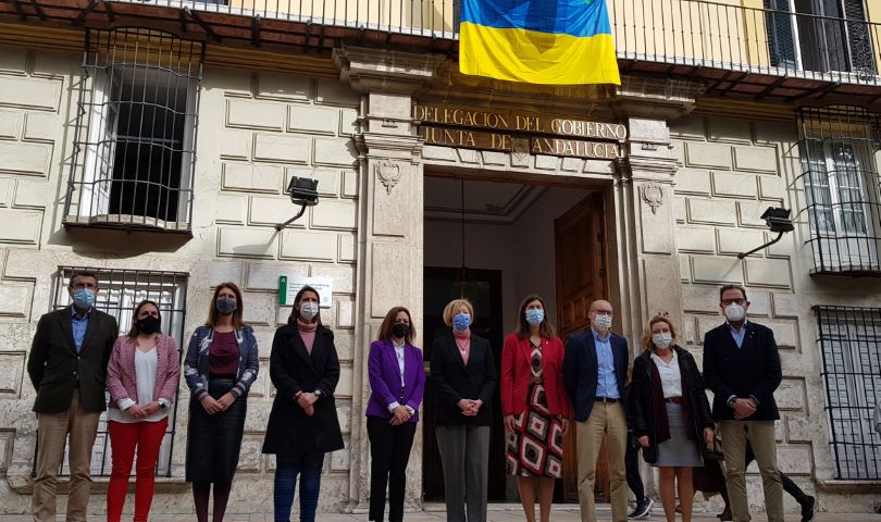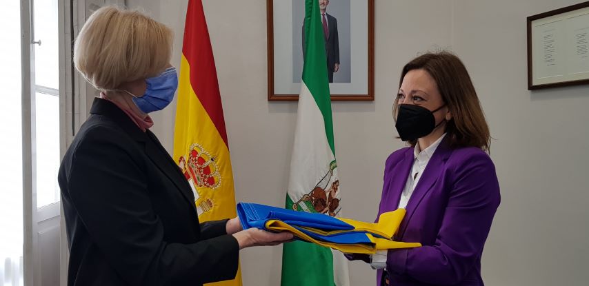 Como gesto simbólico, ambas mandatarias han desplegado la bandera de Ucrania en la fachada de la sede de la delegación del Gobierno en Málaga, para posteriormente iniciar una reunión junto a delegados territoriales de la Junta de Andalucía.