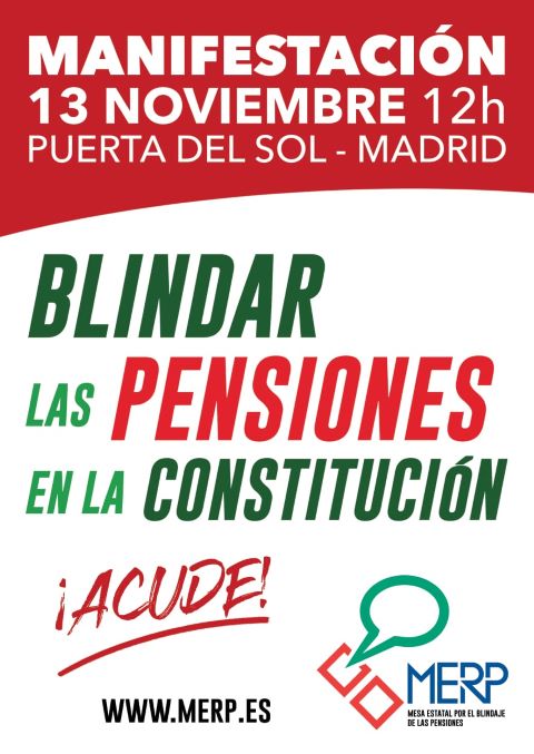 Por eso, el 13 de noviembre, la MERP saldrá a la calle, como hace cada lunes en las plazas de toda España. La manifestación será el sábado 13 de noviembre, a las 12:00, en Madrid, se iniciará en la Puerta del Sol y acabará en la Plaza del Museo Reina Sofía. La MERP llama a acudir a la manifestación del 13N en Madrid a todos los ciudadanos, con independencia de su ideología, color o siglas políticas, para unir a todo el mundo en torno al blindaje de las pensiones.