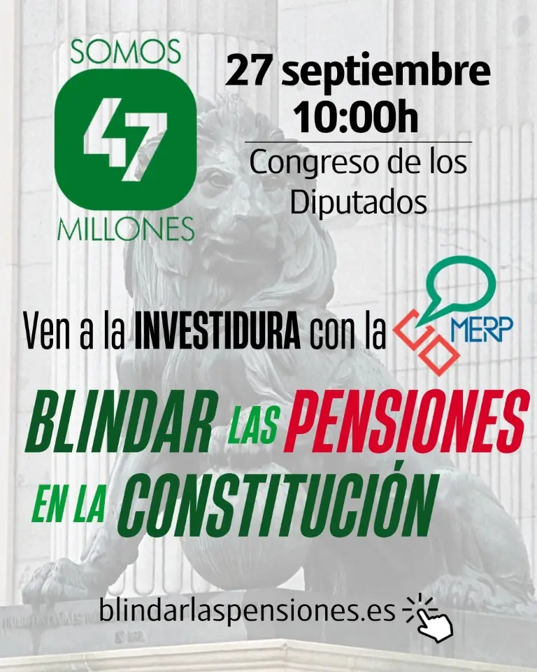 (MERP) La Mesa Estatal por el Blindaje de las Pensiones (MERP) se concentrará en el Congreso de los Diputados en la segunda jornada de la investidura de Alberto Nuñez Feijóo, el 27 de septiembre, a las 10:00 horas.