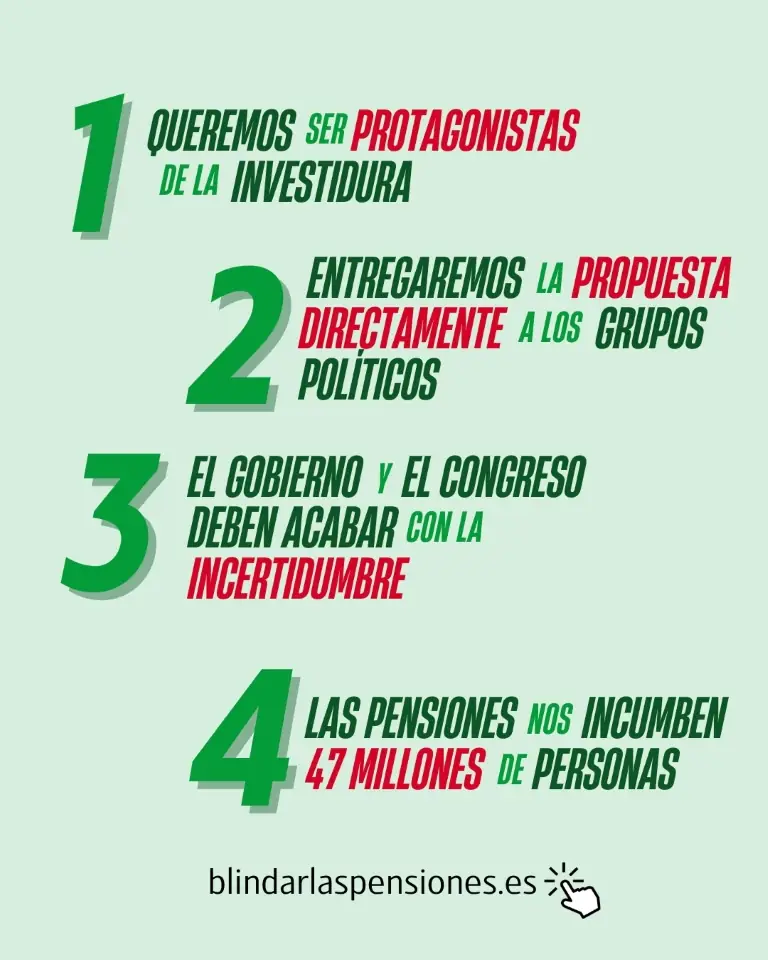 Según los portavoces de la MERP, “no es una concentración de protesta, sino la expresión ciudadana de una propuesta amplia y unitaria, en la que les vamos a entregar un documento a los portavoces de los grupos políticos con la necesidad del blindaje de las pensiones en la Constitución, para que la tengan en cuenta tanto en la investidura como durante la legislatura, en cuanto ésta arranque”.