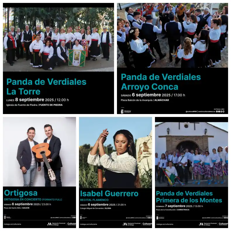 Además, las pandas de verdiales Primera de los Montes y La Torre estarán en Carratraca y Fuente de Piedra los días 7 y 8 de septiembre, respectivamente