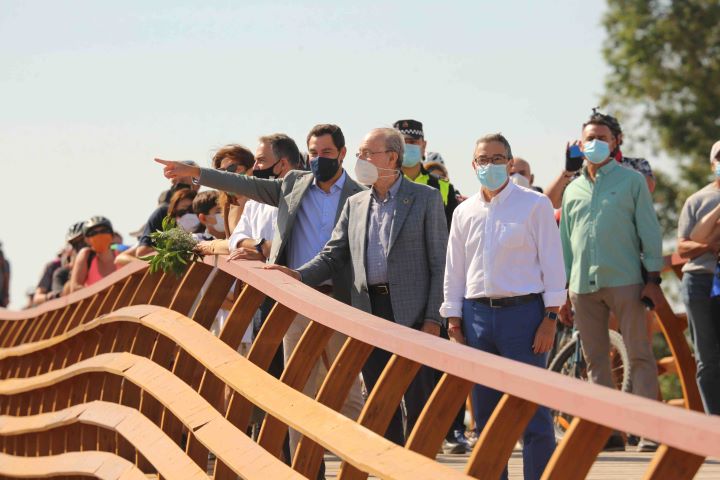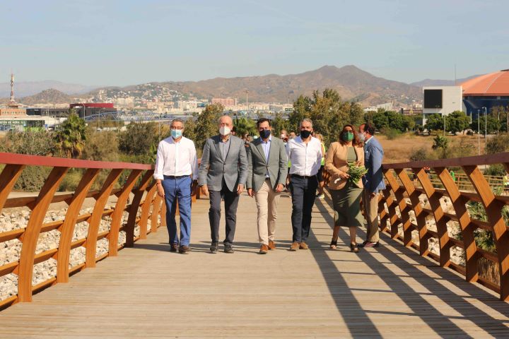 El presidente de la Diputación de Málaga, Francisco Salado, ha inaugurado hoy junto al presidente de la Junta de Andalucía, Juan Manuel Moreno Bonilla; al consejero de la Presidencia, Administración Pública e Interior de la Junta, Elías Bendodo; y al alcalde de Málaga, Francisco de la Torre, este puente peatonal que permite unir el final del paseo marítimo de Poniente, en la zona de Sacaba Beach, con Guadalmar.