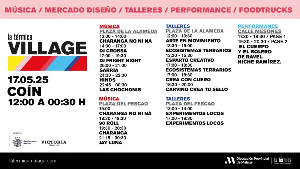 La Térmica Village, uno de los proyectos más ambiciosos del centro de cultura contemporánea de la Diputación de Málaga, desembarca en el municipio de Coín este sábado, 17 de mayo, para ofrecer a vecinos y visitantes más de doce horas de programación con conciertos, dj sets, ‘performance’, talleres de arte y ciencia, actividades para toda la familia, mercado de diseño, gastronomía y la música de No Ni Ná, reciente ganadora del premio Mejor Charanga de España 2025. Desde las 12:00 a las 00:30, este evento gratuito llenará de ambiente las plazas de la Alameda y del Pescao y la calle Mesones. Habrá tres zonas de talleres, tres escenarios y una veintena de puestos de venta.