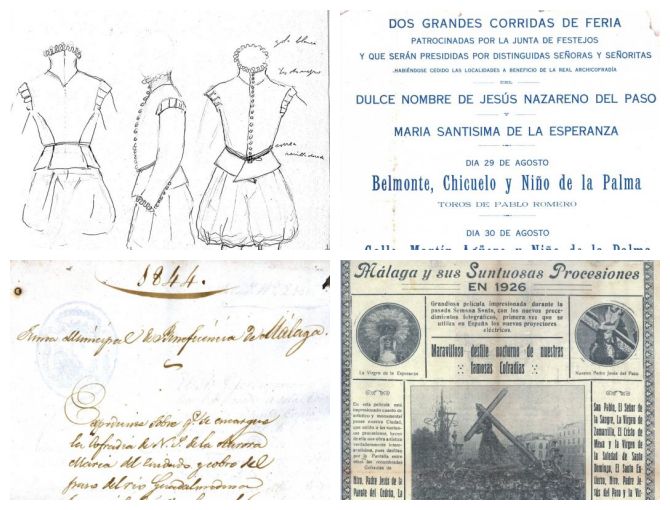 De esta forma la web recoge carteles de promoción de eventos como corridas de toros a beneficio de cofradías, como es el caso de la corrida de 1926 a favor de la Hermandad del Sepulcro o la proyección en la plaza de toros e la película ‘Málaga y sus Suntuosas Procesiones’, cinta que se estrenó el 6 de agosto de 1926 con un evento en el que se cantaron saetas y participaron bandas de cornetas y tambores. El cartel es un testimonio gráfico en el que se recogen las desparecidas imágenes de la Virgen de la Esperanza y de Nuestro Padre Jesús del Paso.