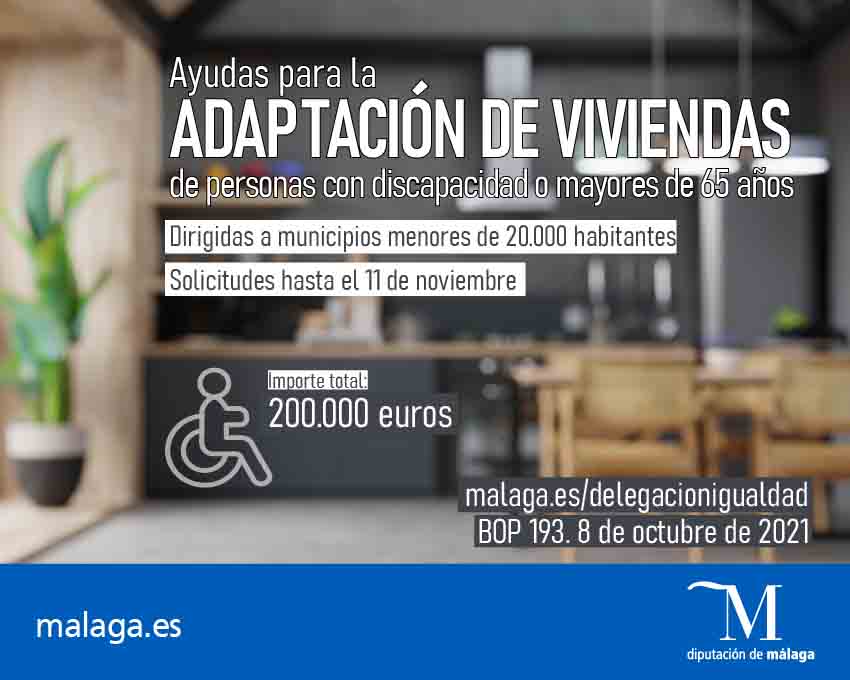 El Boletín Oficial de la Provincia ha publicado, con fecha 8 de octubre, la convocatoria para la concesión de ayudas económicas de los servicios sociales de la Diputación de Málaga correspondiente a la adecuación funcional de viviendas de las personas con discapacidad (igual o superior al 33%)  y mayores de 65 años, que residan en municipios menores de 20.000 habitantes de la provincia.