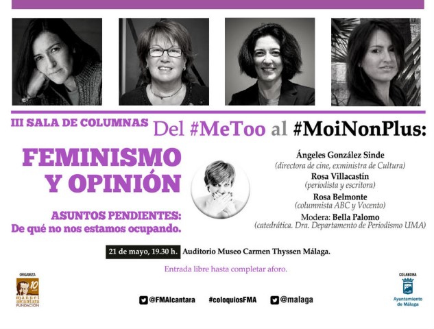 La cineasta y exministra de Cultura Ángeles González Sinde y las periodistas Rosa Villacastín y Rosa Belmonte, participarán el próximo lunes en la segunda jornada de conferencias ‘Feminismo y Opinión’, que se enmarca dentro del ciclo ‘III Sala de Columnas’ y que organiza la Fundación Manuel Alcántara en colaboración con el Ayuntamiento de Málaga.