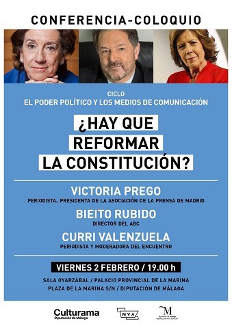 Moderado por la periodista Curri Valenzuela, actual columnista del diario ABC y gran conocedora de la realidad política española gracias a su dilatada trayectoria tanto en el ámbito nacional como internacional, el ciclo comenzó a celebrarse el pasado 7 de diciembre, y continuará el próximo viernes, 2 de febrero, de nuevo en la Sala Oyarzábal de la Diputación (Plaza de la Marina, 4), con la presidenta de la Asociación de la Prensa de Madrid, Victoria Prego, y el director del diario ABC, Bieito Rubido, como protagonistas de un debate que girará en torno a la reforma de la Constitución. Será a las 19.00 horas, con entrada libre hasta completar aforo.