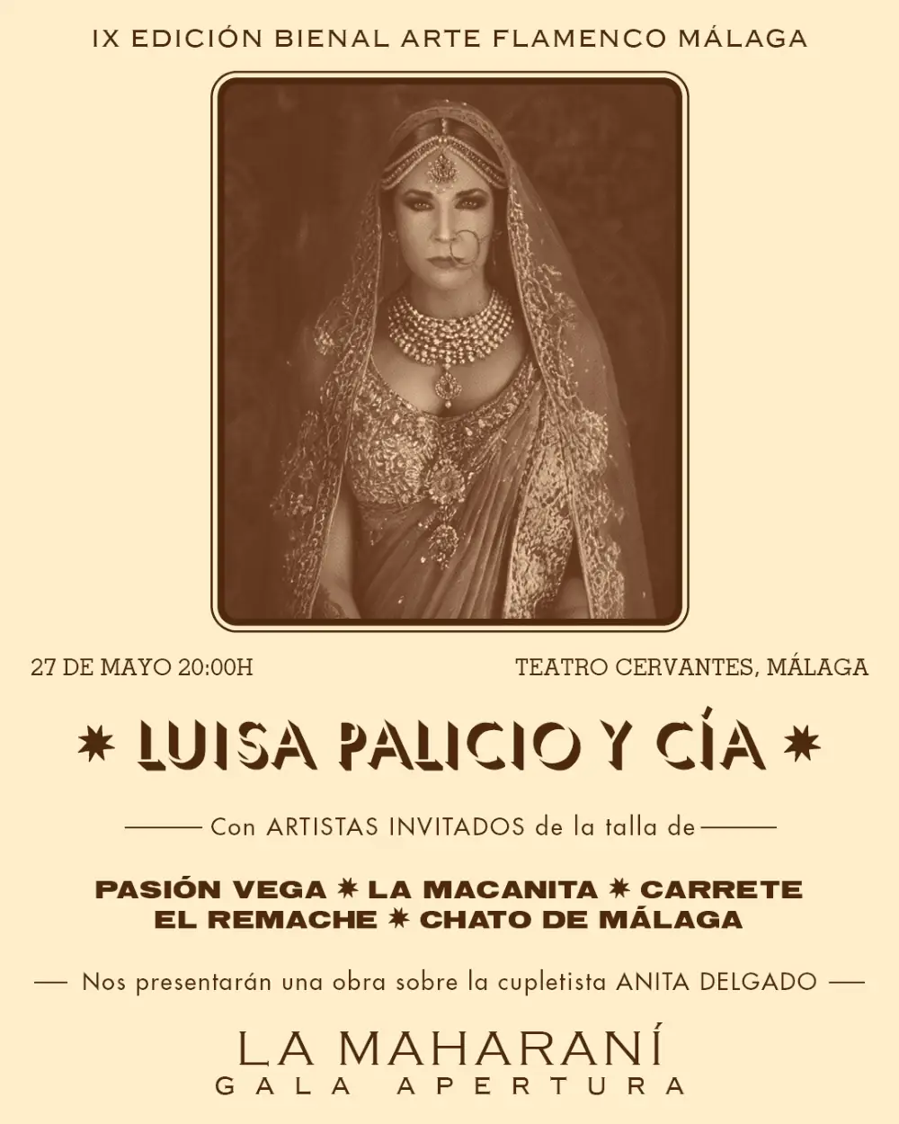 El próximo martes, 27 de mayo, a partir de las 20:00 horas, se levantará en el teatro Cervantes el telón de la IX Bienal de Arte Flamenco de Málaga de la Diputación con un espectáculo de estreno, ‘La maharaní’, de la compañía de Luisa Palicio, que estará acompañada por artistas invitados como Pasión Vega, Carrete, La Macanita, El Remache y Chato de Málaga.