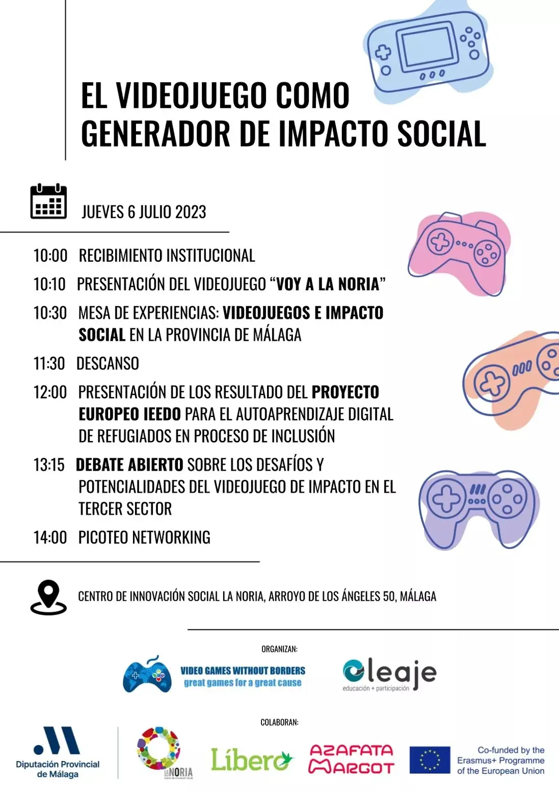 La Asociación Oleaje, Videojuegos Sin Fronteras y la Noria de la Diputación de Málaga anuncian la celebraración de la jornada ‘El Videojuego Como Generador de Impacto Social’, que se celebrará el próximo día 6 de julio en el Centro de Innovación Social La Noria, ubicada en la Avenida Arroyo de Los Ángeles, 50) de 10:00 a 14:00 horas. La asistencia a este evento es libre y no será necesario hacer ningún tipo de reserva ni presentar invitación.