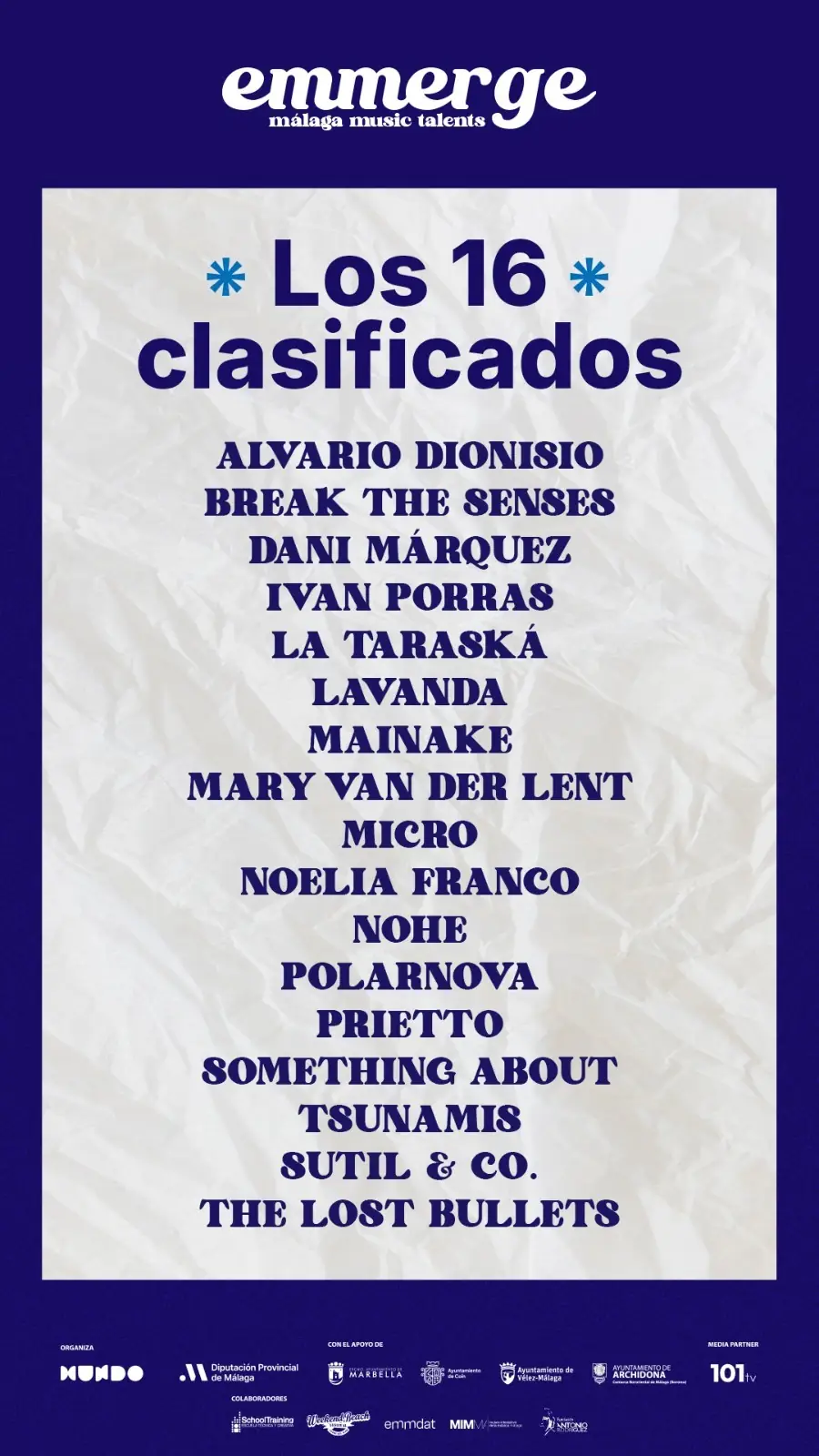 Se tratan de Álvaro Dionisio, Break the Senses, Dani Márquez, Iván Porras, La Taraská, Lavanda, Mainake, Mary Van Der Lent, Micro, Noelia Franco, Nohe, Polarnova, Prietto, Something About Tsunamis, Sutil & Co. y The Lost Bullets.
