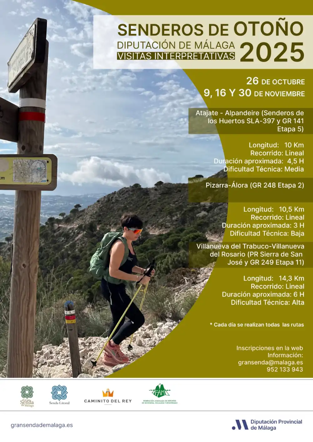 El programa incluye un sendero de dificultad baja entre Pizarra y Álora, uno de dificultad media entre Atajate y Alpandeire, y uno de dificultad alta entre Villanueva del Trabuco y Villanueva del Rosario
