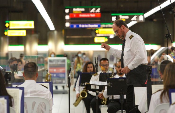Los usuarios del Metro de Málaga han podido disfrutar hoy, además, de un concierto de la Banda Municipal de Música de Málaga, que dirige Manuel Marvizón, en la estación de El Perchel-María Zambrano.