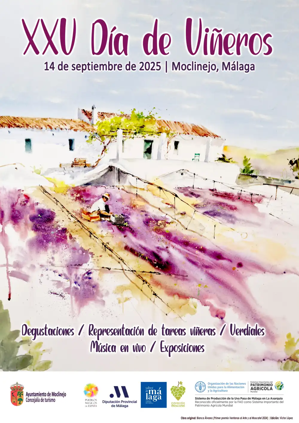 Y ha explicado que el cartel de este año representa la obra ganadora del primero premio del jurado del concurso de pintura Ventanas al Arte y al Moscatel, realizada por Blanca Álvarez y que muestra un lagar típico de la Axarquía.