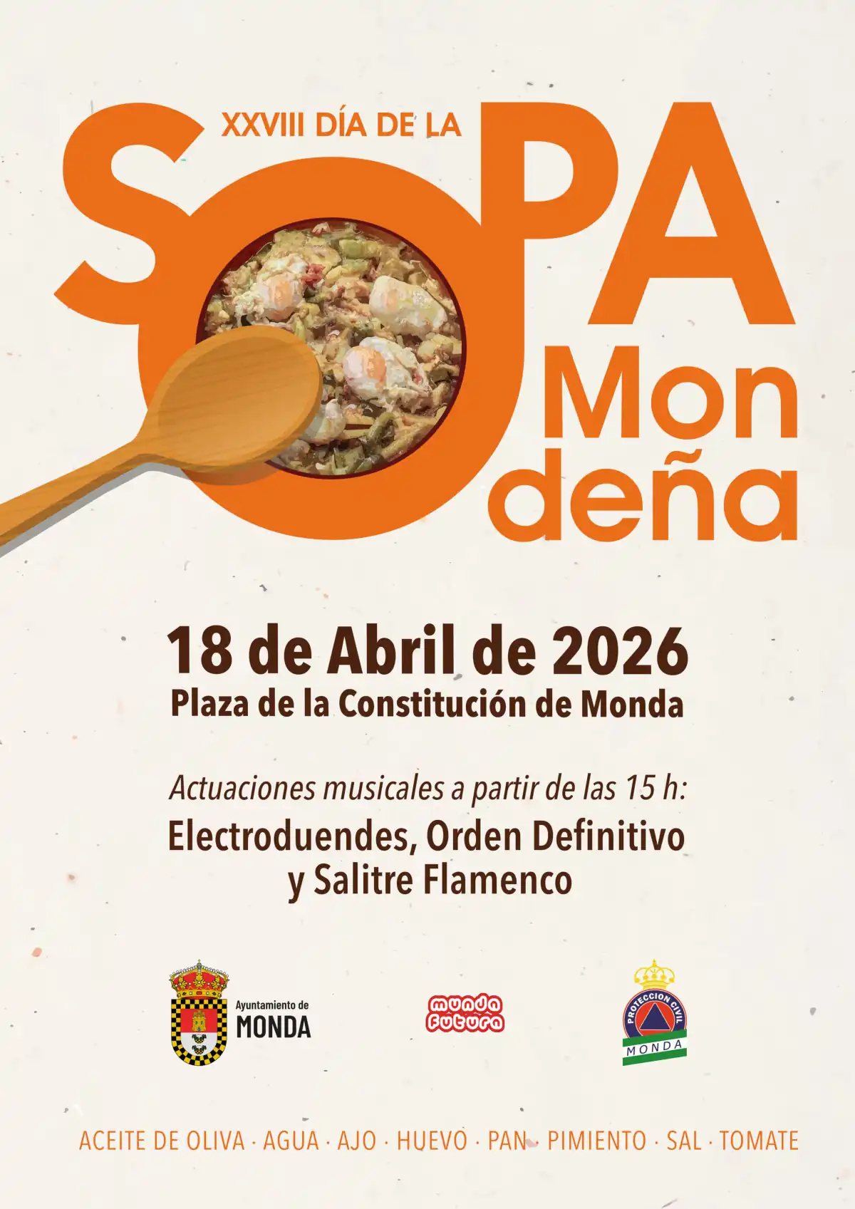 El municipio de Monda ya tiene todo preparado para celebrar una de sus citas más emblemáticas. El próximo sábado 18 de abril de 2026, la localidad acogerá la XXVIII edición del Día de la Sopa Mondeña, una festividad declarada de Singularidad Turística Provincial que cada año congrega a vecinos, vecinas y visitantes en torno a la tradición, la gastronomía y la convivencia.