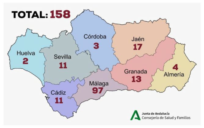“La voluntad de este Gobierno es tener informados en todo momento a los andaluces sobre la evolución del coronavirus en Andalucía. En estos momentos, hay 158 casos positivos en Andalucía: 4 en Almería, 11 en Cádiz, 3 en Córdoba, 13 en Granada, 2 en Huelva, 17 en Jaén, 97 en Málaga y 11 en Sevilla”, ha concretado.