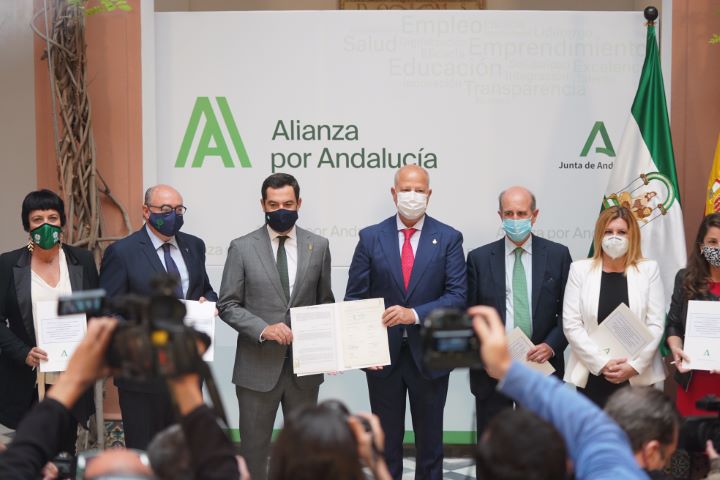 El presidente de la Junta de Andalucía, Juanma Moreno, ha presidido este martes la firma del acuerdo entre la Consejería de Educación y Deporte y organizaciones patronales, titulares y sindicatos para reforzar las plantillas docentes de los centros educativos concertados en más de 300 nuevos profesores y profesoras para el curso 2020/21, a sumar a los 970 ya incorporados por el acuerdo del mes de agosto pasado.