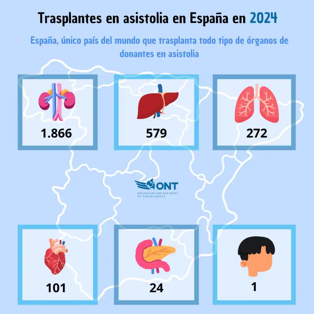 España es líder mundial en donantes y trasplantes de órganos, destacando especialmente en la donación en asistolia controlada. En 2024, más de la mitad de las donaciones provinieron de asistolia, y España es el único país capaz de realizar trasplantes de todos los tipos a partir de este tipo de donantes. España alcanza una tasa de 52,6 donantes por millón de población, cifra récord en el país y en el mundo.