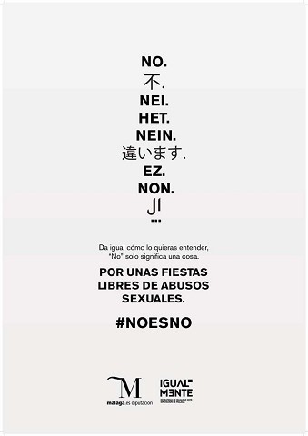 La Diputación de Málaga continúa su lucha en contra de la violencia de género y las agresiones de carácter sexual. En esta ocasión lanza una campaña con el lema ‘No es No’, cuya finalidad es prevenir las posibles agresiones sexuales en las fiestas de los municipios menores de 20.000 habitantes a través de la divulgación de material informativo y una guía dirigida a jóvenes y adolescentes donde se recogen los conceptos básicos para entender qué es la sumisión química y cómo evitarla, además de una relación de teléfonos de contacto a través de los cuales los interesados podrán recibir información, resolver dudas y denunciar cualquier tipo de agresión sexual.