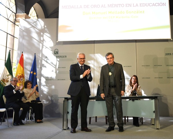 Una de las Medallas de Oro al Mérito en la Educación ha sido para Manuel Mellado González, director del Centro del Profesorado (CEP) ‘Marbella-Coín, por su liderazgo democrático y su contribución a la mejora del sistema de formación permanente del profesorado. Diplomado en Magisterio ha participado en movimientos de renovación pedagógica y en grupos de investigación tales como Rosa Sensat