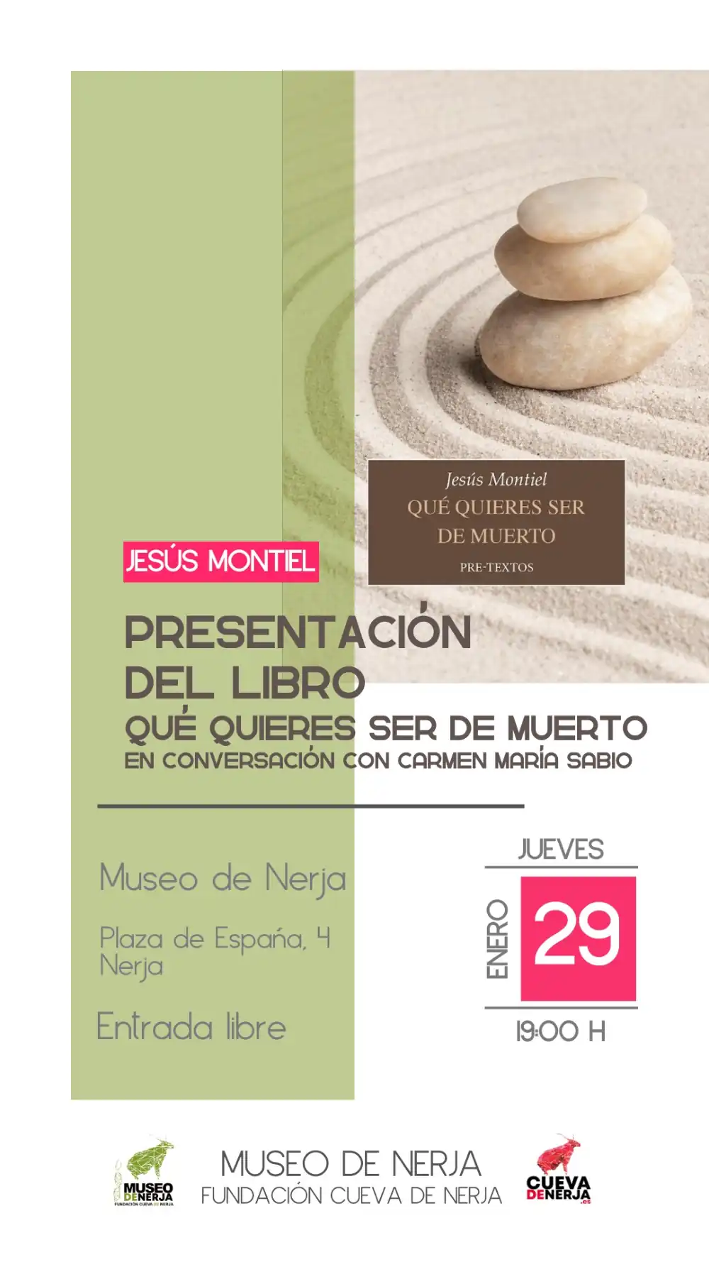 El Museo de Nerja acogerá el próximo jueves, 29 de enero, a las 19:00 horas, la presentación del libro ‘Qué quieres ser de muerto’, del escritor Jesús Montiel, en un acto que contará con una conversación con Carmen María Sabio. La entrada será libre hasta completar aforo.