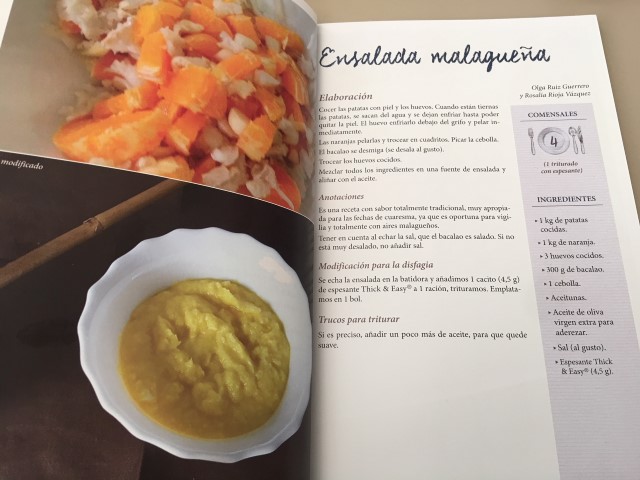 La presentación del recetario muestra fotos de la receta original y la versión adaptada, sus ingredientes y su forma de elaboración para modo disfagia, así como trucos específicos para lograr la textura adecuada en cada una de ellas.