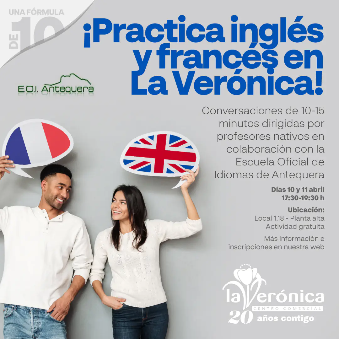 El centro comercial La Verónica de Antequera acogerá los próximos días 10 y 11 de abril encuentros conversacionales de acceso libre y gratuito para practicar inglés y francés que estarán dirigidos por profesores nativos de la Escuela de Idiomas de Antequera.