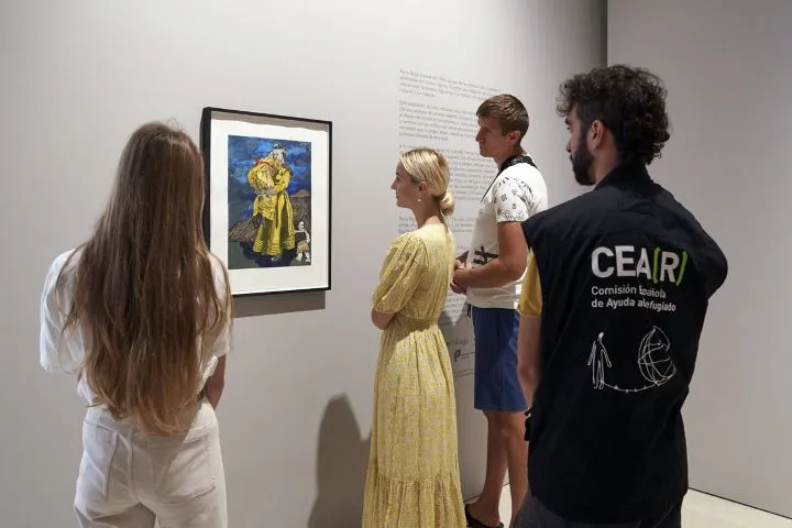 Parte del grupo de refugiados observando «La fuga», una obra de Paula Rego de 2009