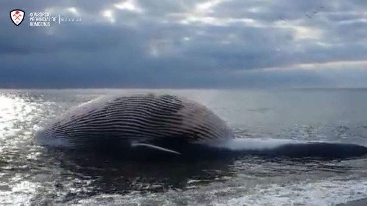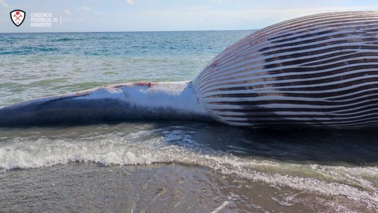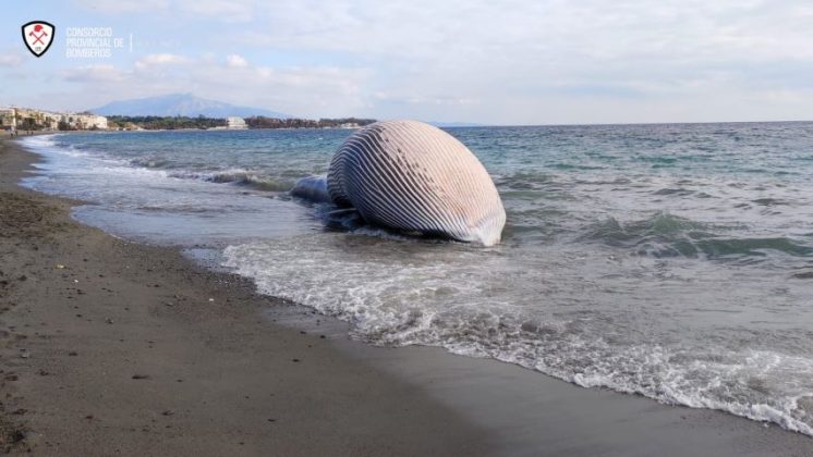 En la playa de La Rada de Estepona ha aparecido esta mañana el cadáver de una ballena 9 metros y 8 toneladas. Se trata de un rocual común macho varado en la orilla. Un operativo del Consorcio Provincial de Bomberos se encuentra sacando del agua al cetáceo. Se está procediendo a eslingar al animal para elevarlo y llevarlo a una zona de carga pesada del puerto.