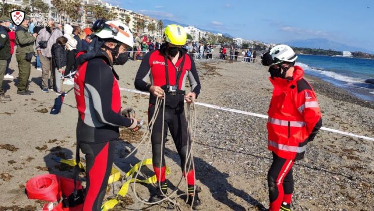 El CPB trabaja para sacar del agua a una ballena varada en la playa de La Rada de Estepona