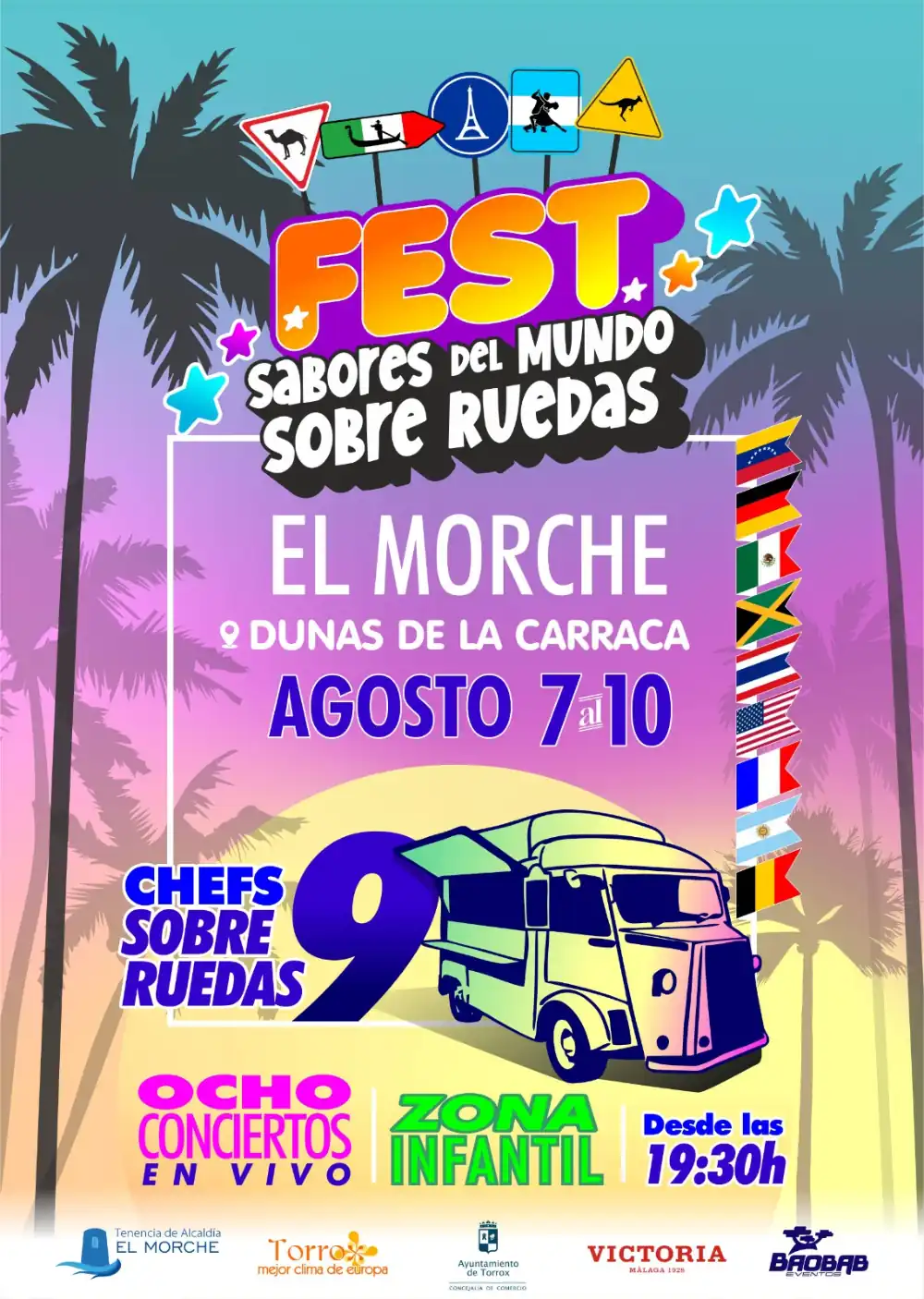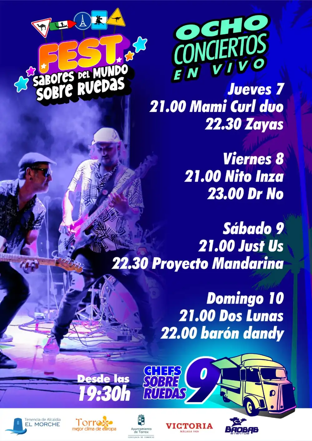 El festival abrirá sus puertas cada día a partir de las siete y media de la tarde con propuestas culinarias de distintos lugares del Mundo representados a través de las food trucks participantes. Además, habrá una zona infantil para los más pequeños, puestos de artesanía y una programación musical que llenará las noches de ritmo y energía junto al mar. Los conciertos en directo comenzarán mañana, jueves 7, con Mami Curl Dúo y Zayas. El viernes 8 actuarán Nito Inza y Dr. No. El sábado 9, la noche estará animada por Just Us y Proyecto Mandarina, y el festival se cerrará el domingo 10 con Dos Lunas y Barón Dandy.
