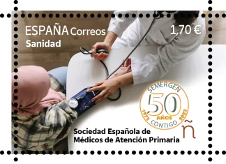 Correos presenta un sello dedicado al 50º aniversario de la Sociedad Española de Médicos...