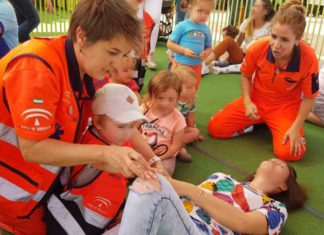 El 061 enseña primeros auxilios a 170 niños en Fuengirola utilizando muñecos de peluche