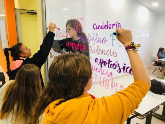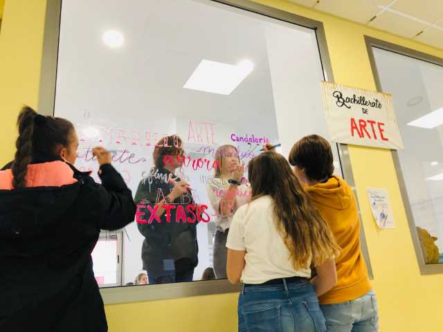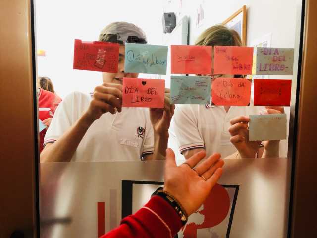En este Día Mundial nos hemos querido colocar al otro lado del relato; ese que ocupa el inventor de historias, el creador de sueños… Hemos coqueteado con las letras del idioma para acabar en la RAE con un singular juego de búsqueda de ‘mi palabra favorita’. Nuestros alumnos han elegido algunas tan líricas como ‘infinito’ y otras tan prosaicas como ‘tapete’. Regalaremos literatura salida de nuestro puño y letra con un curioso ‘amigo invisible’ literario en el que iremos trabajando a lo largo de la semana y que condensará lo mejor de nosotros mismos en un pequeño sobre ‘tuneado’ que nos intercambiaremos en unos días. Nos acercamos a la ‘realidad relatada’ con la creación de una singular historia de ficción redactada párrafo a párrafo por los estudiantes de Lengua. Ni siquiera los ventanales de las aulas se librarán de este frenesí literario; pues en ellos y en clave lírica están dejando su impronta los alumnos de Bachillerato, quienes garabatean un bello ‘palabrario’ cargado de arte, color y forma.