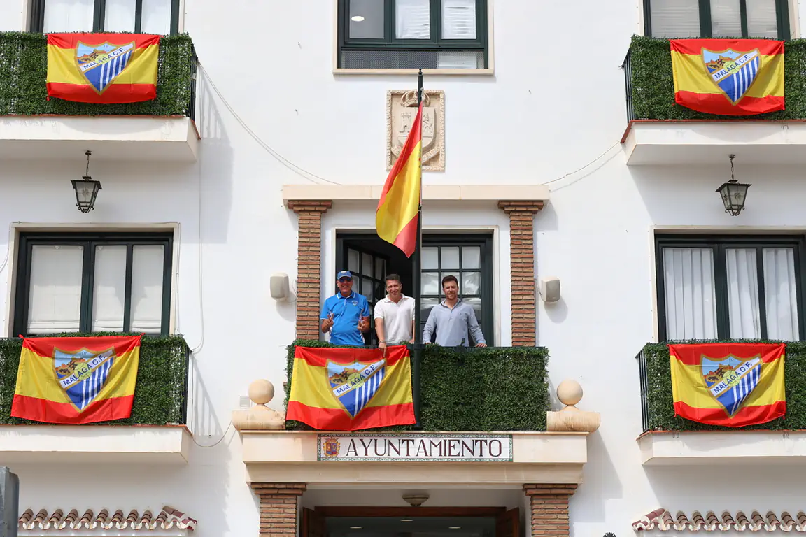 Las banderas han sido colocadas en los balcones de la fachada del Ayuntamiento de Torrox por el alcalde, Óscar Medina, junto al concejal de Deportes, José Manuel Fernández, y Lorenzo Blumer como vocal y en representación de la Peña Malaguista Conejito de Torrox «Duda 17». El alcalde y el delegado de Deportes han invitado a vecinos, asociaciones, colectivos y empresarios de Torrox a lucir también sus banderas «en el partido más importante de la historia reciente del Málaga Club de Fútbol».