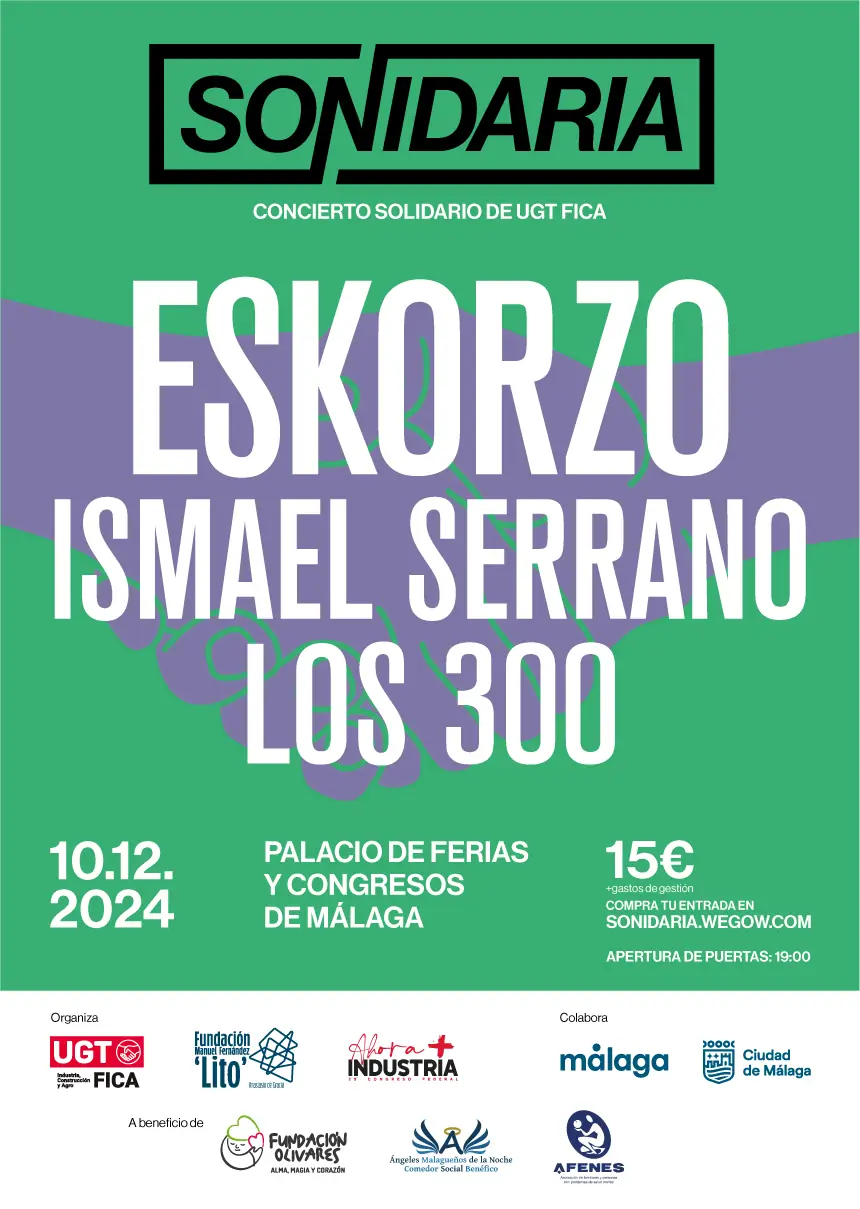 Eskorzo, Ismael Serrano y Los 300 protagonizarán este concierto enmarcado en el 29 º Congreso Federal que UGT FICA va a celebrar entre el 11 y el 13 de diciembre en Málaga bajo el lema “Ahora, más industria”. Este evento reunirá a más de 600 delegados y más de 500 invitados de todo el mundo y junto al concierto solidario se celebrará una Feria Industrial donde numerosas empresas mostrarán sus productos.