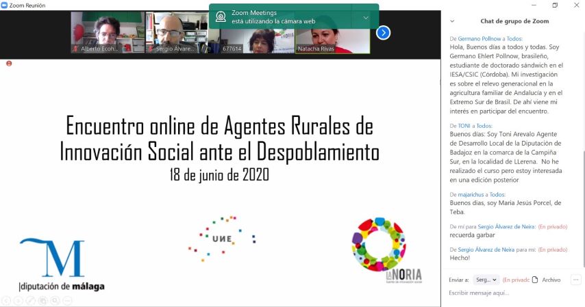 Casi un centenar de agentes rurales han participado en un encuentro online, celebrado por La Noria y la Delegación de Atención al Despoblamiento de la Diputación de Málaga el pasado 18 de junio, cuya finalidad era estudiar e impulsar iniciativas de innovación social para hacer frente al despoblamiento en la provincia de Málaga.