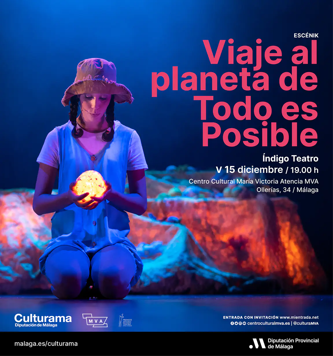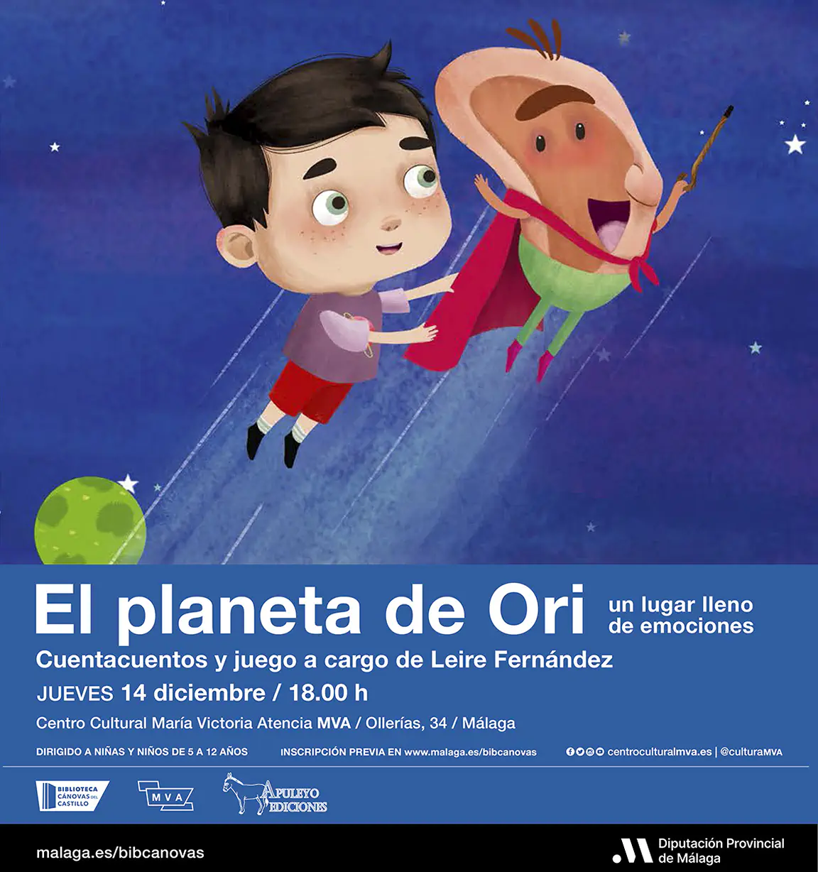 El Centro Cultural María Victoria Atencia de la Diputación de Málaga (calle Ollerías, 34) continúa con su oferta semanal y ofrece una programación para la semana que viene destinada al público infantil. Los más pequeños podrán participar en el cuentacuentos ‘El planeta de Ori’, que tendrá lugar el jueves 14 de diciembre, en la Biblioteca Cánovas del Castillo y el viernes, 15 de diciembre, la compañía Índigo Teatro representará la obra ‘Viaje al planeta de Todo es Posible’.