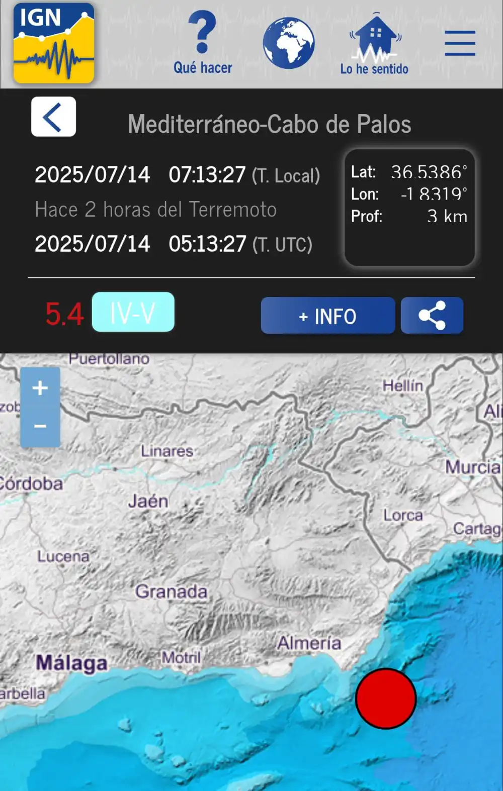 En la mañana de hoy, a las 08:17 horas, se ha registrado un terremoto de magnitud 5,4 en la escala de Richter con epicentro en el mar, frente a la costa oriental de Almería, concretamente en la zona del Cabo de Palos, según ha informado el Instituto Geográfico Nacional (IGN).
