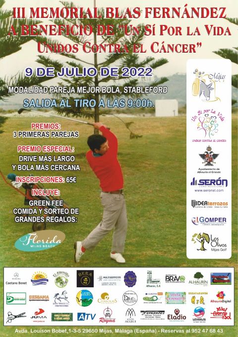 ALHAURÍN EL GRANDE | 30 DE JUNIO 2022 Un Sí Por La Vida – Unidos Contra el Cáncer ya se prepara para su próxima actividad solidaria. El tercer torneo de golf “Memorial Blas Fernández” se celebrará el próximo 9 de julio en Mijas Golf, a beneficio de pacientes de cáncer y sus familias.