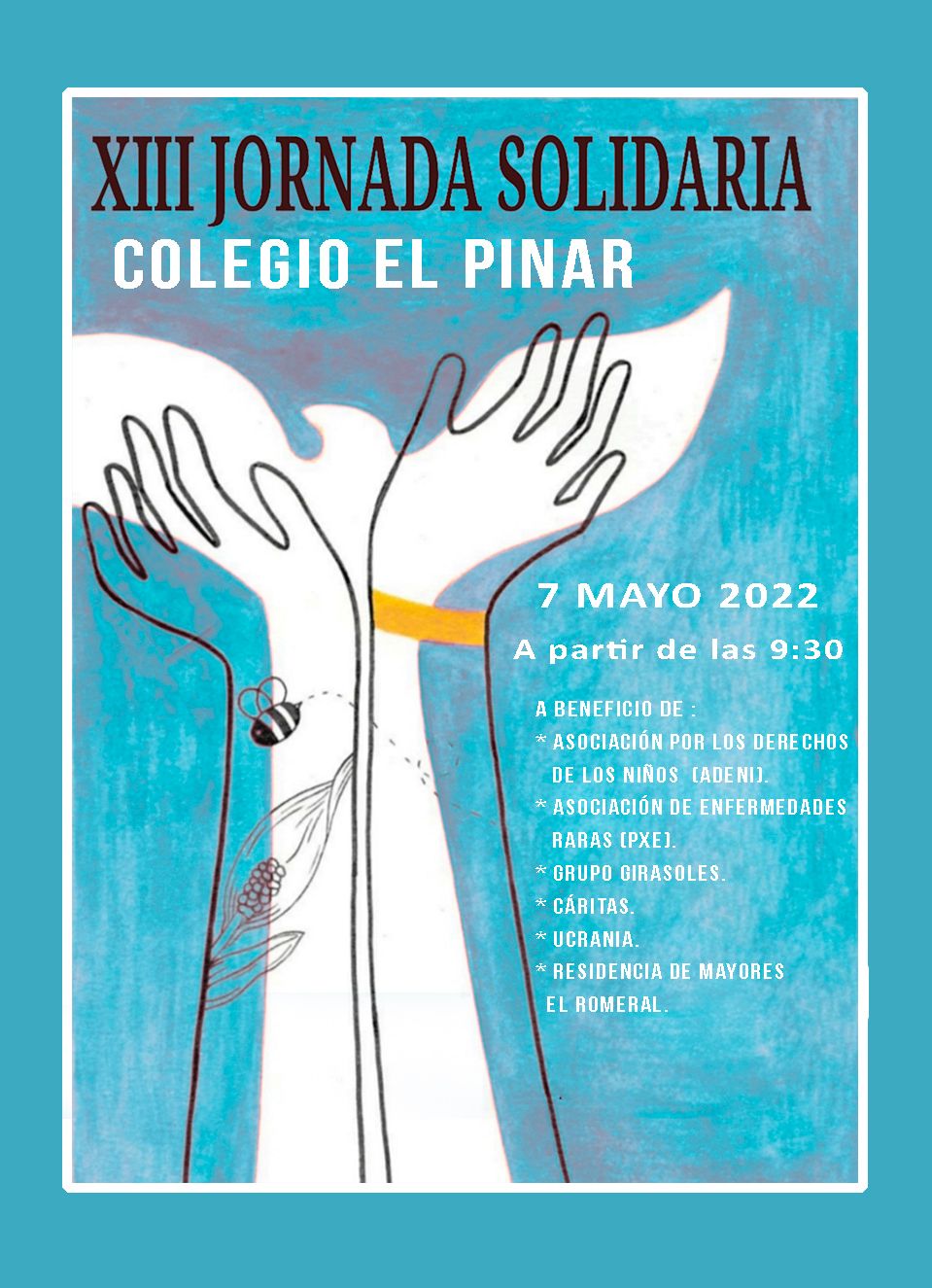 El equipo directivo hace un llamamiento a la participación en este tradicional evento solidario que contará con propuestas deportivas, artísticas, culinarias; así como como recogida de alimentos y otras iniciativas lúdicas dirigidas a la recaudación de fondos en apoyo de las ONG ‘PXE España’, ‘Grupo Girasoles’, ‘Cáritas’, Asociación por los Derechos de los Niños (ADENI); así como una donación específica al pueblo ucraniano y a organizaciones como el Centro de Mayores de ‘El Romeral’