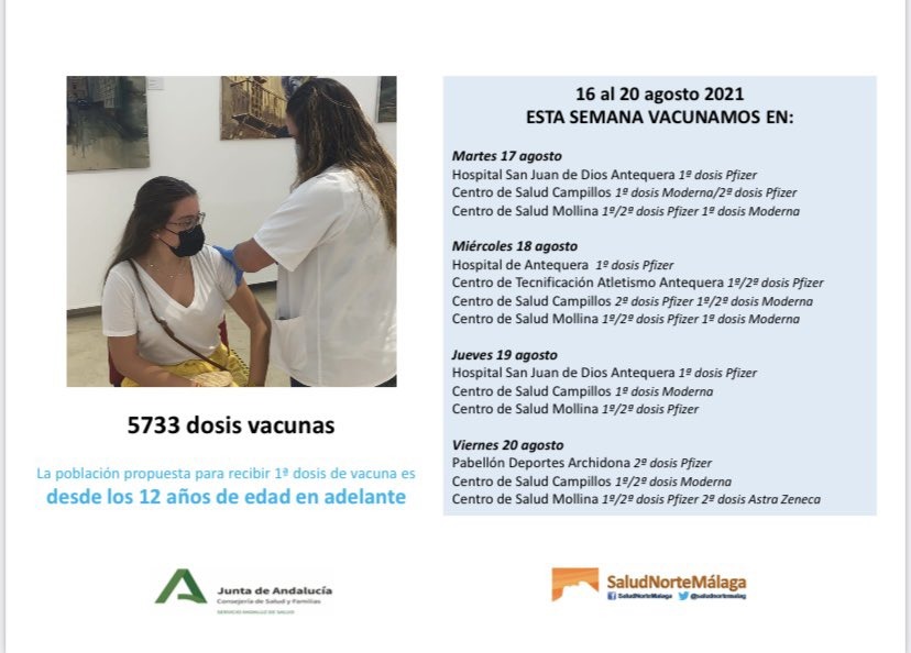 Cuadrante de plan de vacunación en distrito norte (comarca de Antequera) para esta semana. Pero en centros de salud y hospitales ya sabéis que no se puede grabar ni acceder.