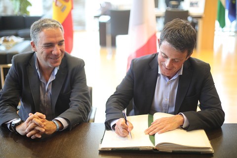 El ex primer ministro de Francia Manuel Valls ha visitado esta tarde la sede de la Diputación de Málaga, donde ha sido recibido por el presidente Elías Bendodo en su despacho. Valls ha firmado en el Libro de Honor de la institución para posteriormente protagonizar un encuentro del ciclo Aula de Pensamiento Político en La Térmica.